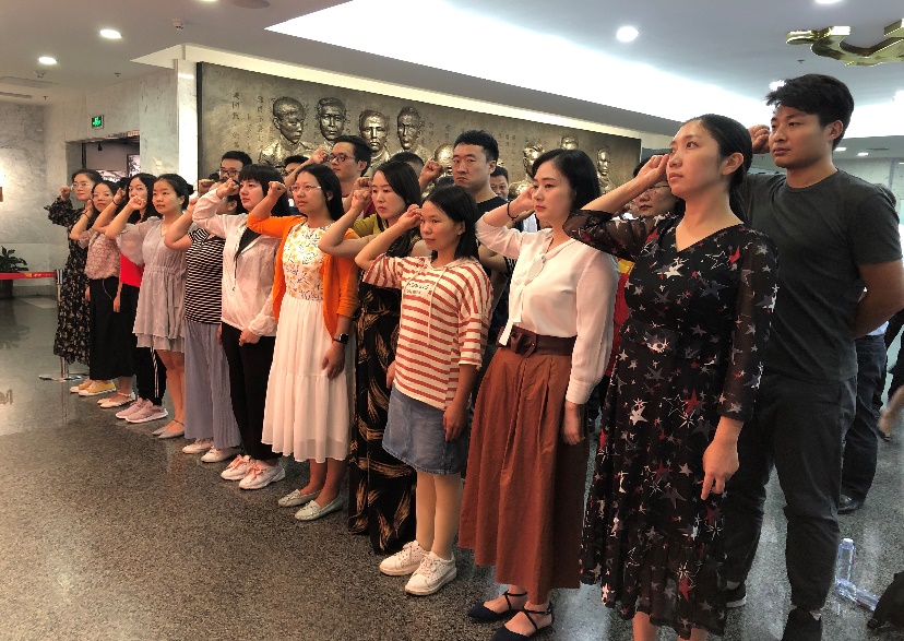 重温1次入党誓词:在庄严的一大会址纪念馆里,党员们在党支部书记的带领下重温入党誓词,誓词铿锵有力,震撼人心!