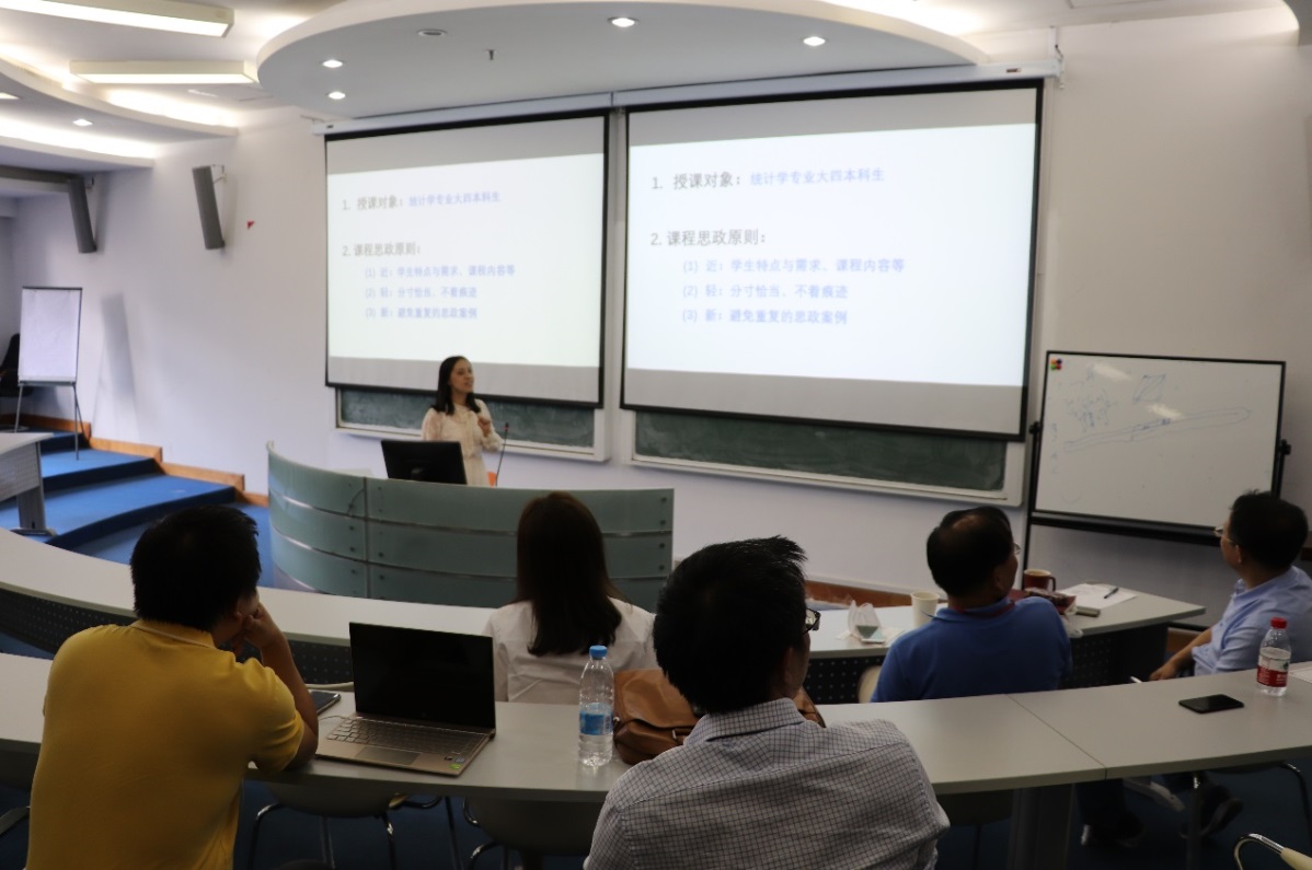 接着,全体党员与闫方洁教授一起进行了课程思政研讨会。闫老师认为课程思政实际是课程育人,教学过程要以专业课内容为主,思政为辅,并建议统计学课程加入在国家建设中的应用的相关案例。李艳、周迎春、吴述金、李育强、贺思辉等教师代表结合各自授课内容开展课程思政教学实践探索,从课程思政的原则、内容、融入手段等方面进行了交流分享。党员们围绕分享内容展开了充分的讨论。