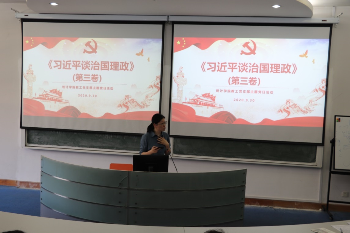 2020年9月30日下午,统计学院教工党支部在理科大楼A510会议室开展了“学习《习近平谈治国理政》第三卷“主题党日活动。活动由统计学院教工党支部书记周迎春主持,统计学院全体党员参加活动。